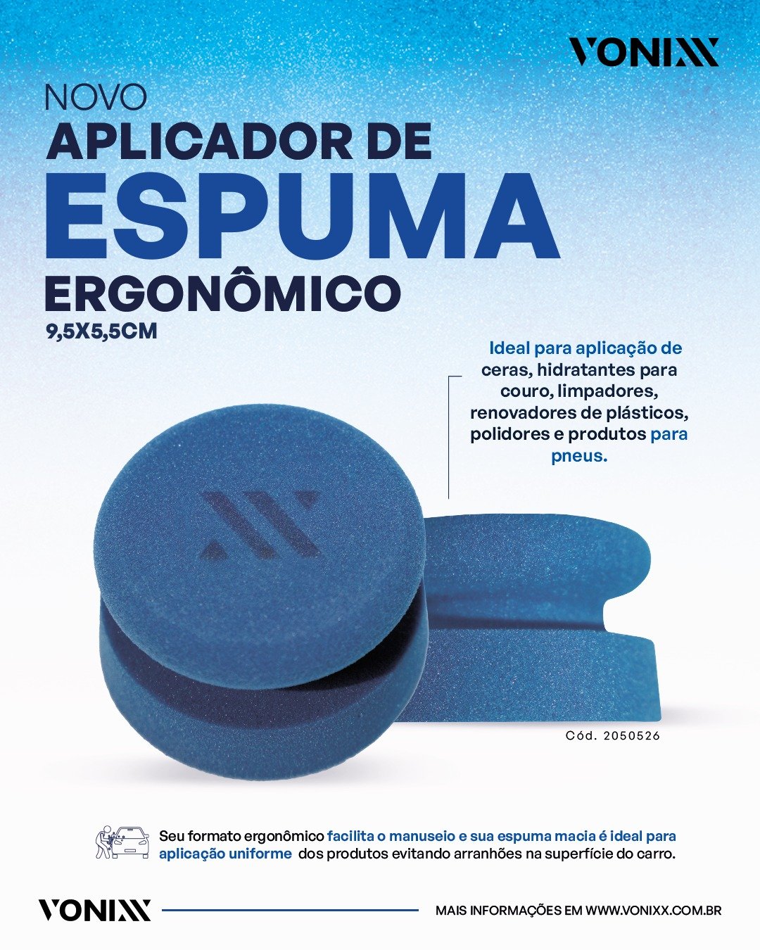 O APLICADOR DE ESPUMA 9,5X5,5CM VONIXX foi projetado com alta qualidade especialmente para aplicação de ceras, hidratantes para couro, limpadores, renovadores de plásticos, polidores e produtos para pneus. Seu formato ergonômico facilita o manuseio e sua espuma macia é ideal para aplicação uniforme dos produtos evitando arranhões na superfície do carro.