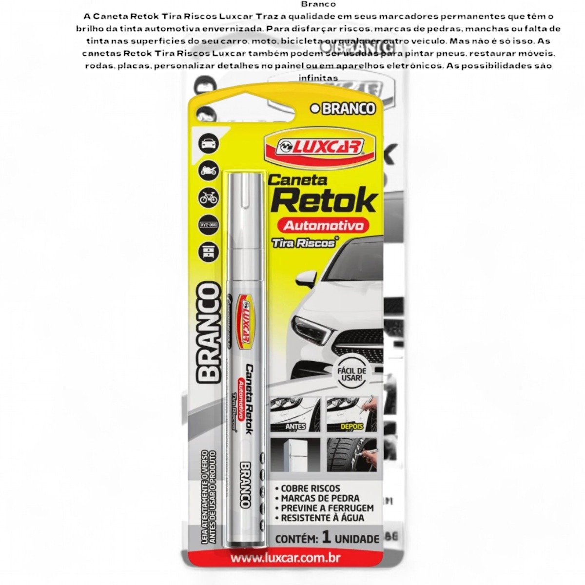 A CANETA RETOK TIRA RISCOS LUXCAR TRAZ A QUALIDADE EM SEUS MARCADORES PERMANENTES QUE TÊM O BRILHO DA TINTA AUTOMOTIVA ENVERNIZADA. PARA DISFARÇAR RISCOS, MARCAS DE PEDRAS, MANCHAS OU FALTA DE TINTA NAS SUPERFÍCIES DO SEU CARRO, MOTO, BICICLETA OU QUALQUER OUTRO VEÍCULO. MAS NÃO É SÓ ISSO. AS CANETAS RETOK TIRA RISCOS LUXCAR TAMBÉM PODEM SER USADAS PARA PINTAR PNEUS, RESTAURAR MÓVEIS, RODAS, PLACAS, PERSONALIZAR DETALHES NO PAINEL OU EM APARELHOS ELETRÔNICOS. AS POSSIBILIDADES SÃO INFINITAS!