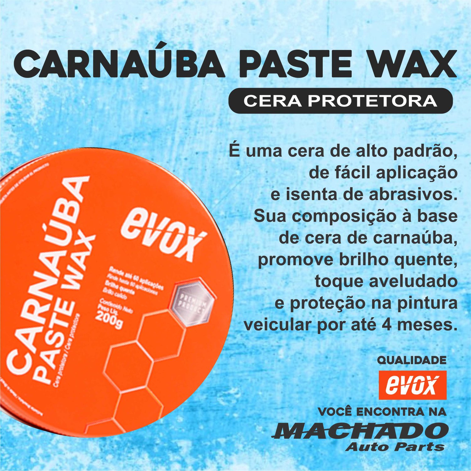 É uma cera de alto padrão, de fácil aplicação e isenta de abrasivos. Sua composição à base de cera de carnaúba 100% natural tipo 1, promove brilho quente, toque aveludado e proteção na pintura veicular por até 4 meses.