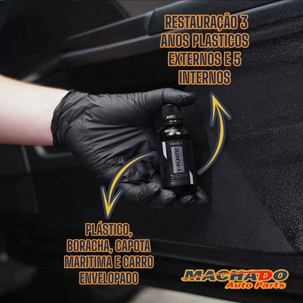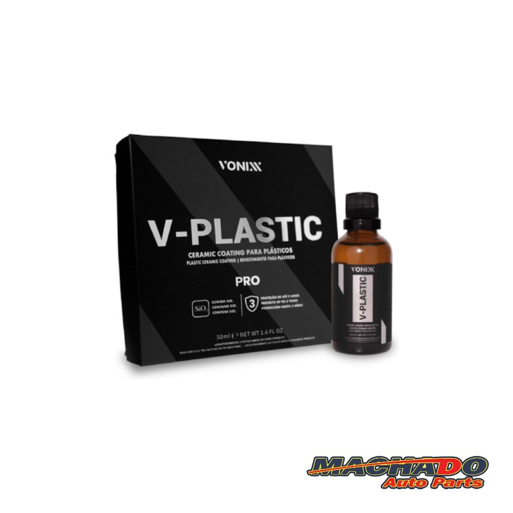 V-Plastic Pro é um coating semipermanente, desenvolvido exclusivamente para tratamento de superfícies plástica, a fim de renovar e restaurar plástico por um período de até três anos. Promove resistência e proteção UV. Também pode ser utilizado em plástico novos, para evitar a degradação do material e prolongar em até três vezes sua vida útil. V-Plastic Pro pode ser aplicado em para-choques, painéis e laterais de portas.