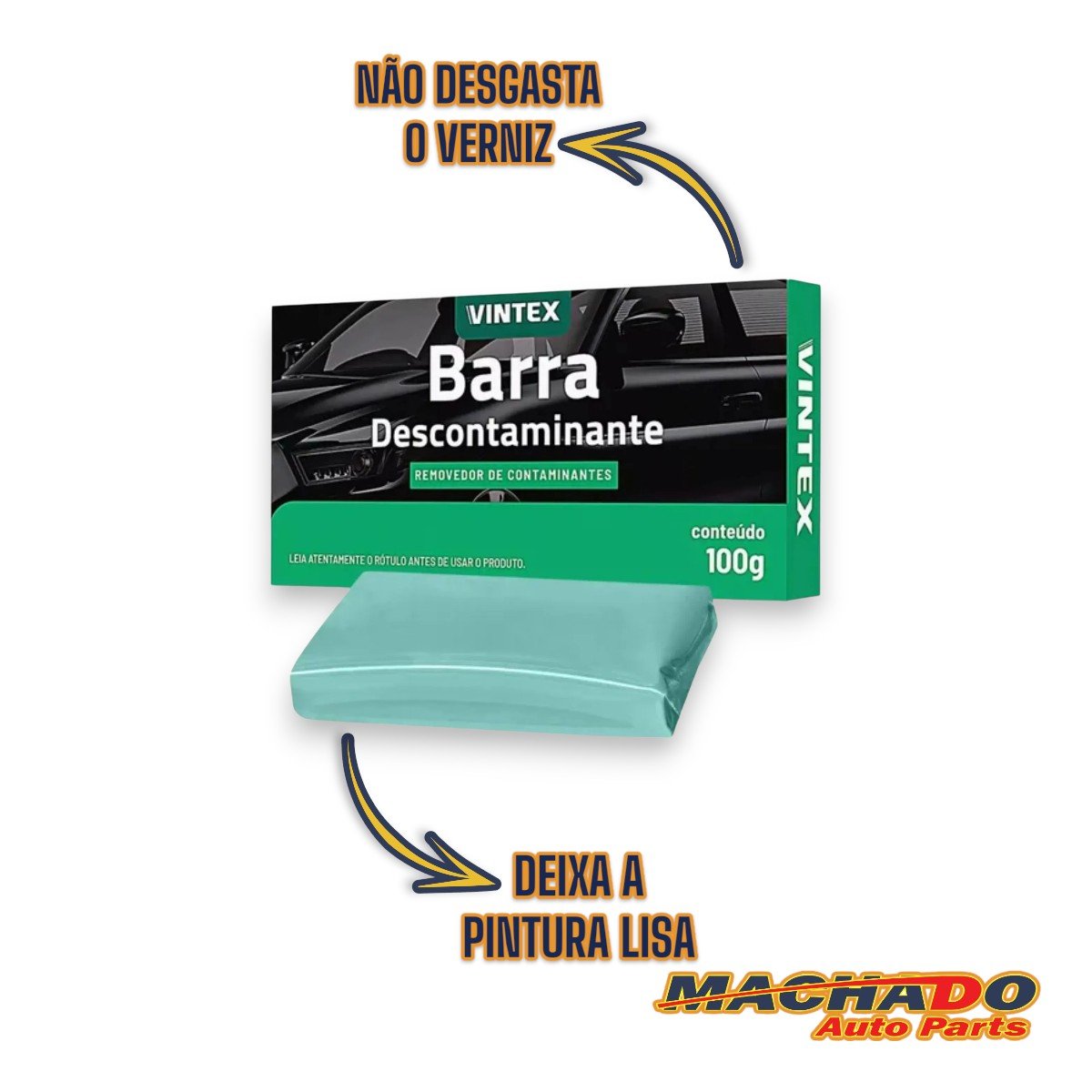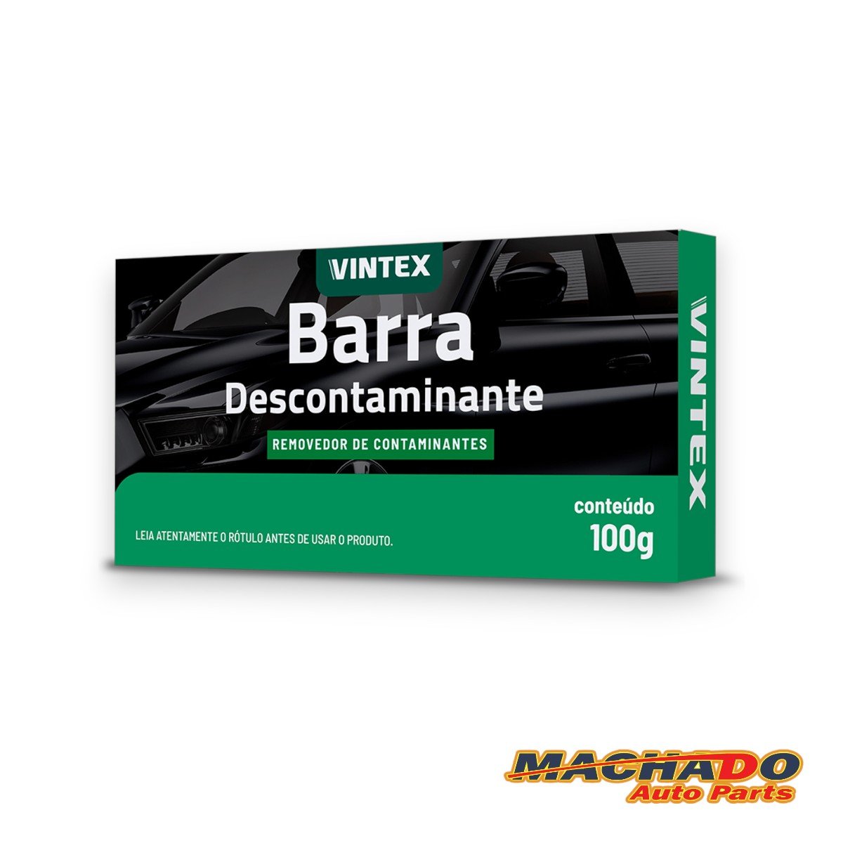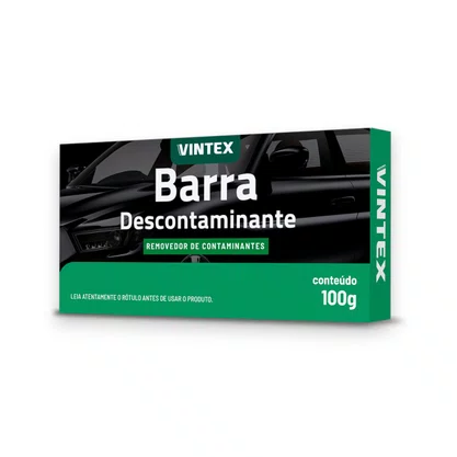 Barra Descontaminante Vintex é um produto desenvolvido especialmente para remoção de contaminantes na pintura do veículo, como pulverização de tintas, seivas de árvores, fezes recentes de pássaros, impactos de insetos, poluição industrial, pó de freio, pigmentos de asfalto e resíduos diversos que danificam a pintura, deixando-a áspera e sem brilho. O produto pode ser utilizado em pintura, vidros, borrachas, cromados e faróis.