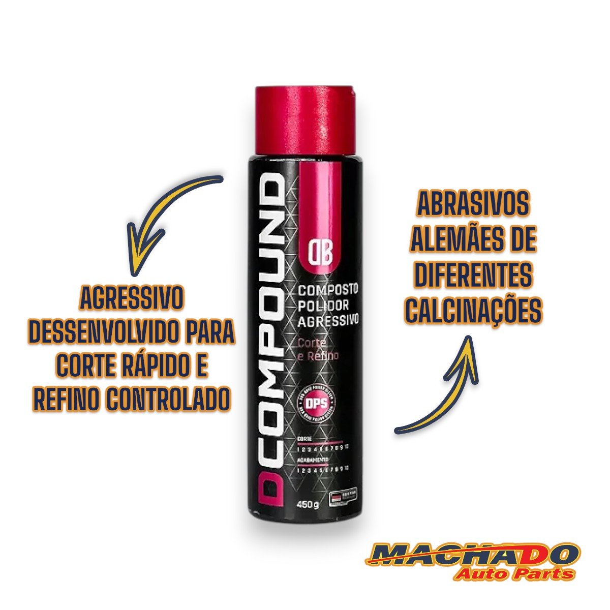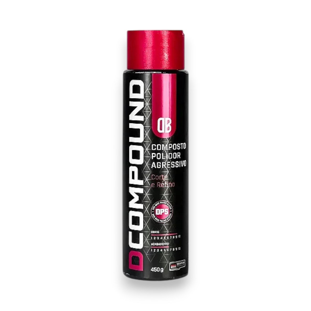 Produto desenvolvido com base em abrasivos alemães para corte e refino, à base de água e de alta tecnologia para um corte limpo e rápido em uma embalagem de 450 g com tampa flip top. Fabricado com abrasivos de calcinações diferentes e emulsão especial. Devido sua alta tecnologia de formulação promove alto rendimento, rapidez no processo e acabamento fino. Suas principais características são: Corte rápido, tanto em politrizes rotativas quanto em roto orbitais. Pode ser utilizado com boina de lã ou espuma agressiva para um corte pesado ou espuma média ou lã de acabamento ajustando a abrasividade ao depender da situação. Se optar por boina de lã ou espuma de corte pesado ou médio, o produto exerce corte agressivo e rápido com refino em situações de marcas de lixamento ou arranhões passivos de correção com polimento. Se optar por boina de espuma refino ou lã de acabamento, promove corte leve e com acabamento, a depender do tipo de dureza da pintura. Fácil remoção dos resíduos da peça.
