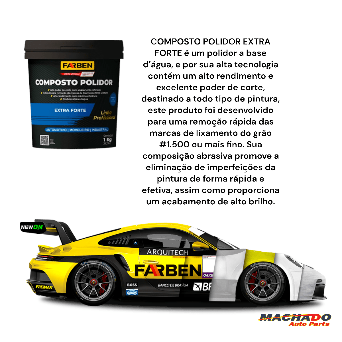 COMPOSTO POLIDOR EXTRA FORTE é um polidor a base d’água, e por sua alta tecnologia contém um alto rendimento e excelente poder de corte, destinado a todo tipo de pintura, este produto foi desenvolvido para uma remoção rápida das marcas de lixamento do grão #1.500 ou mais fino. Sua composição abrasiva promove a eliminação de imperfeições da pintura de forma rápida e efetiva, assim como proporciona um acabamento de alto brilho.