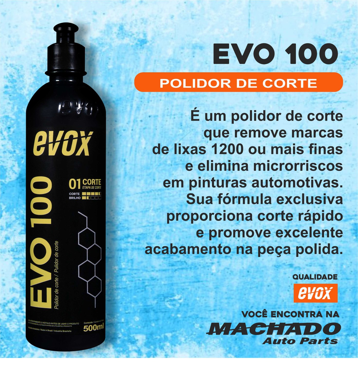 Evo 100 é um polidor de corte que remove de marcas de lixas 1200 ou mais finas e elimina microrriscos em pinturas automotivas. Sua fórmula exclusiva proporciona corte rápido e promove excelente acabamento na peça polida.