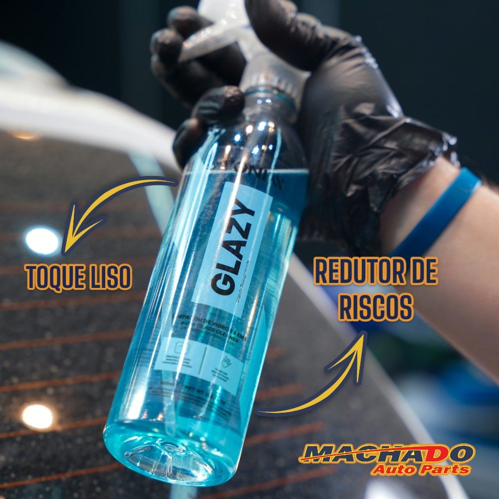 GLAZY é um produto 4 em 1, de alta tecnologia, desenvolvido para vidros em geral, que limpa, protege, condiciona e atua como redutor de riscos. O produto contém polímeros especiais que reduzem o atrito no vidro, diminuindo as chances de riscos causados por limpadores de para-brisas e movimentações dos vidros laterais. Deixa um toque liso e aspecto de vidro novo.