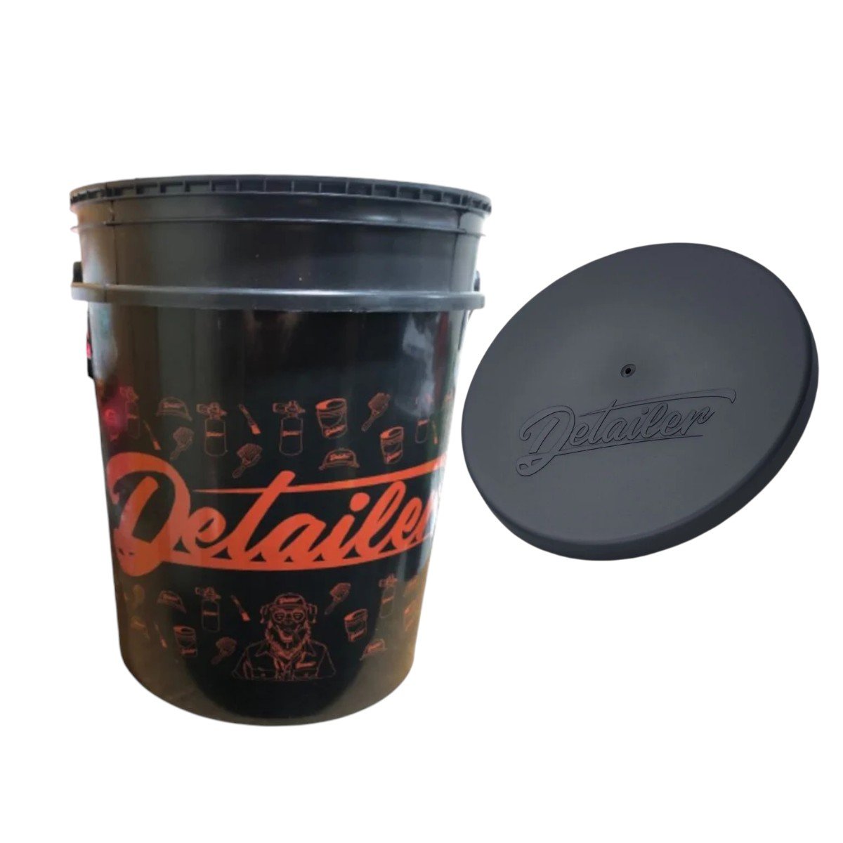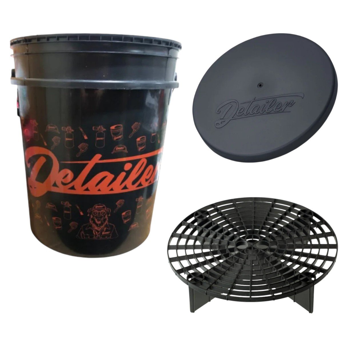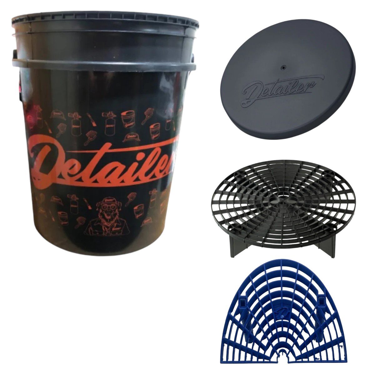 Kit Com Balde Preto 19L Detailer, Grelha inclinada, separador de particulas e tampa para uso em lavagens automotivas.