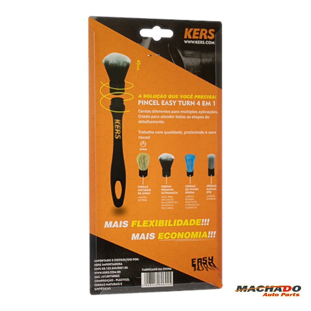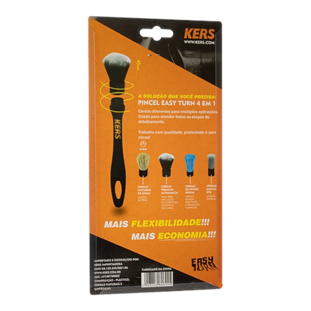 O Pincel Kers easy turn - Pincel que troca as cerdas, possui um kit de 4 diferentes tipos de cerdas para toda a etapa do detalhamento: Cerdas macias premium para partes mais delicadas como black piano, cerdas de nylon resistentes a produtos químicos para aquela etapa que requer mais esfregação, cerdas naturais para limpeza externa e cerdas macias longas.