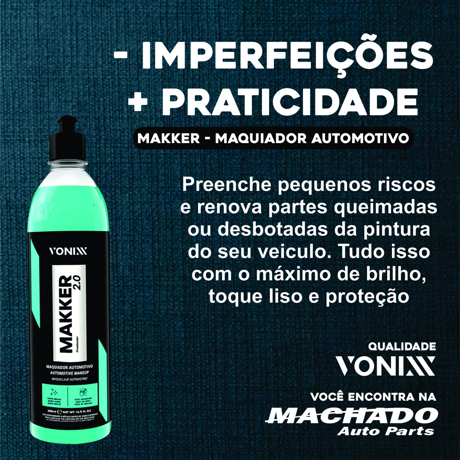 O Makker é um maquiador automotivo e chegou com o objetivo de trazer mais praticidade na hora de deixar o seu veículo com menos imperfeições. Sua fórmula foi desenvolvida exclusivamente para preencher pequenos defeitos e renovar pinturas, dando brilho máximo. Também contendo microabrasivos especiais, o produto é capaz de corrigir defeitos leves se utilizado com aplicador de microfibra ou máquina. Além de maquiar, o Makker deixa um toque liso e garante proteção de até 30 dias.
