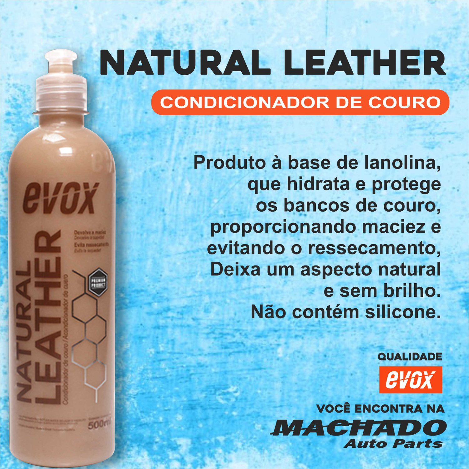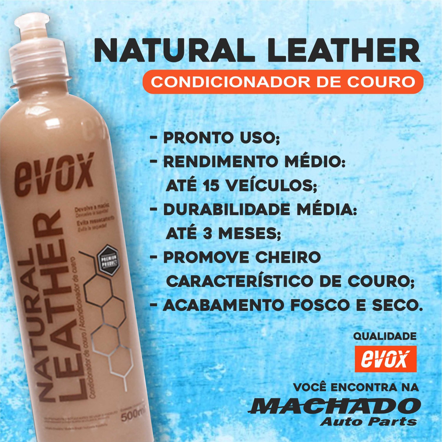 Limpar a superfície com o Leather Cleaner Evox. Aguardar a secagem. Aplicar o Natural Leather com auxílio de aplicador de espuma até completa hidratação. Se necessário, repetir a operação.