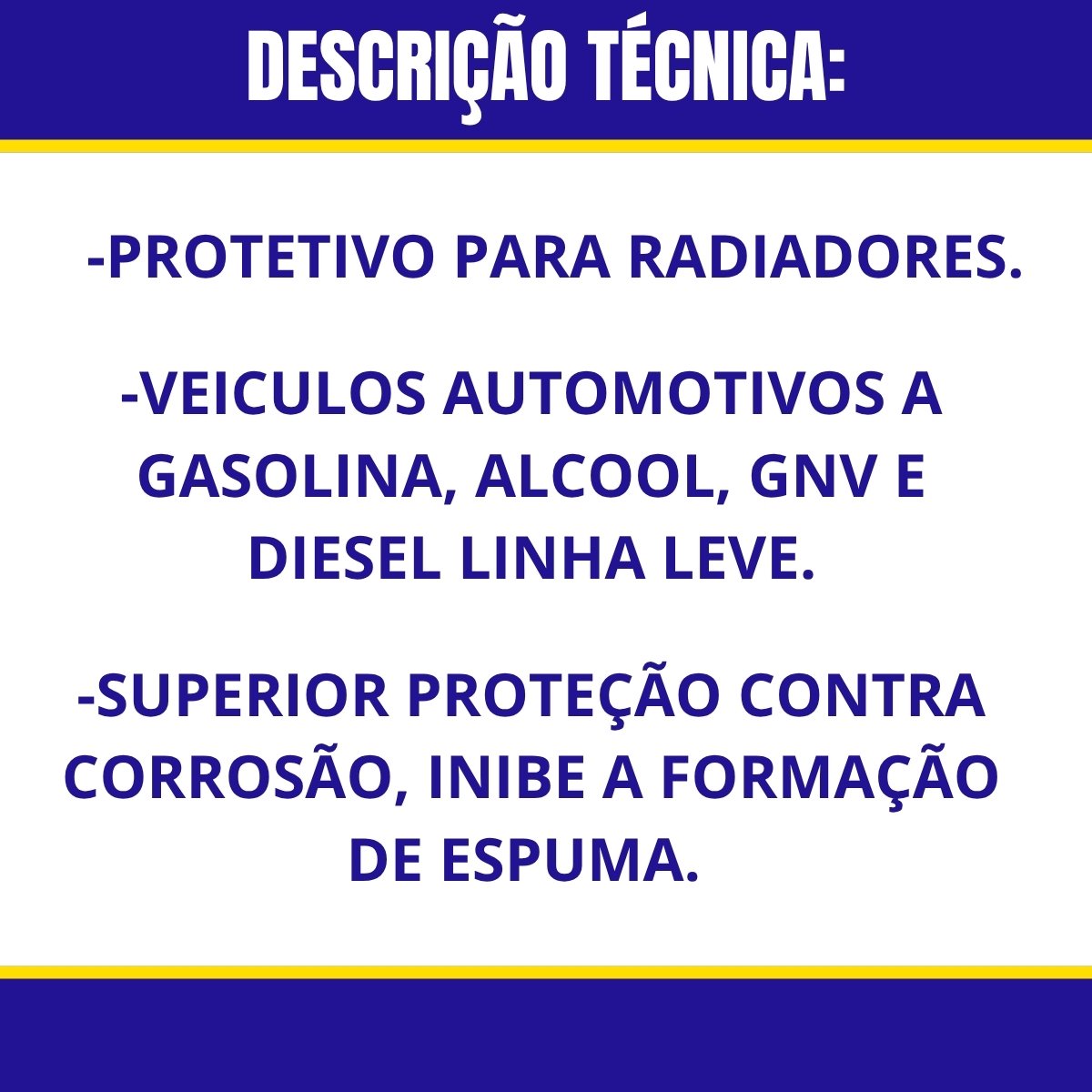 Este fluído é livre de nitritos, fosfatos, aminas e silicatos. Superior proteção contra corrosão, inibe a formação de espuma, baixa o ponto de congelamento e eleva ponto de fervura da água. Compatível com juntas, retentores, elastômeros e outras peças não metálicas que compõe todo sistema de arrefecimento do veículo. Formulação especialmente desenvolvida para atender os requisitos das Normas ASTM D7714 e ASTM D7715. Produto compatível com teste de corrosão da Norma ABNT NBR 13705.