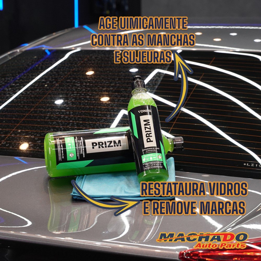 Prizm restaura a transparência em vidros automotivos e remove marcas de água incrustada, impurezas e contaminantes que não saem com a limpeza convencional. O produto age quimicamente contra as manchas e sujeiras, removendo-as facilmente de para-brisas, vidros laterais e traseiros.