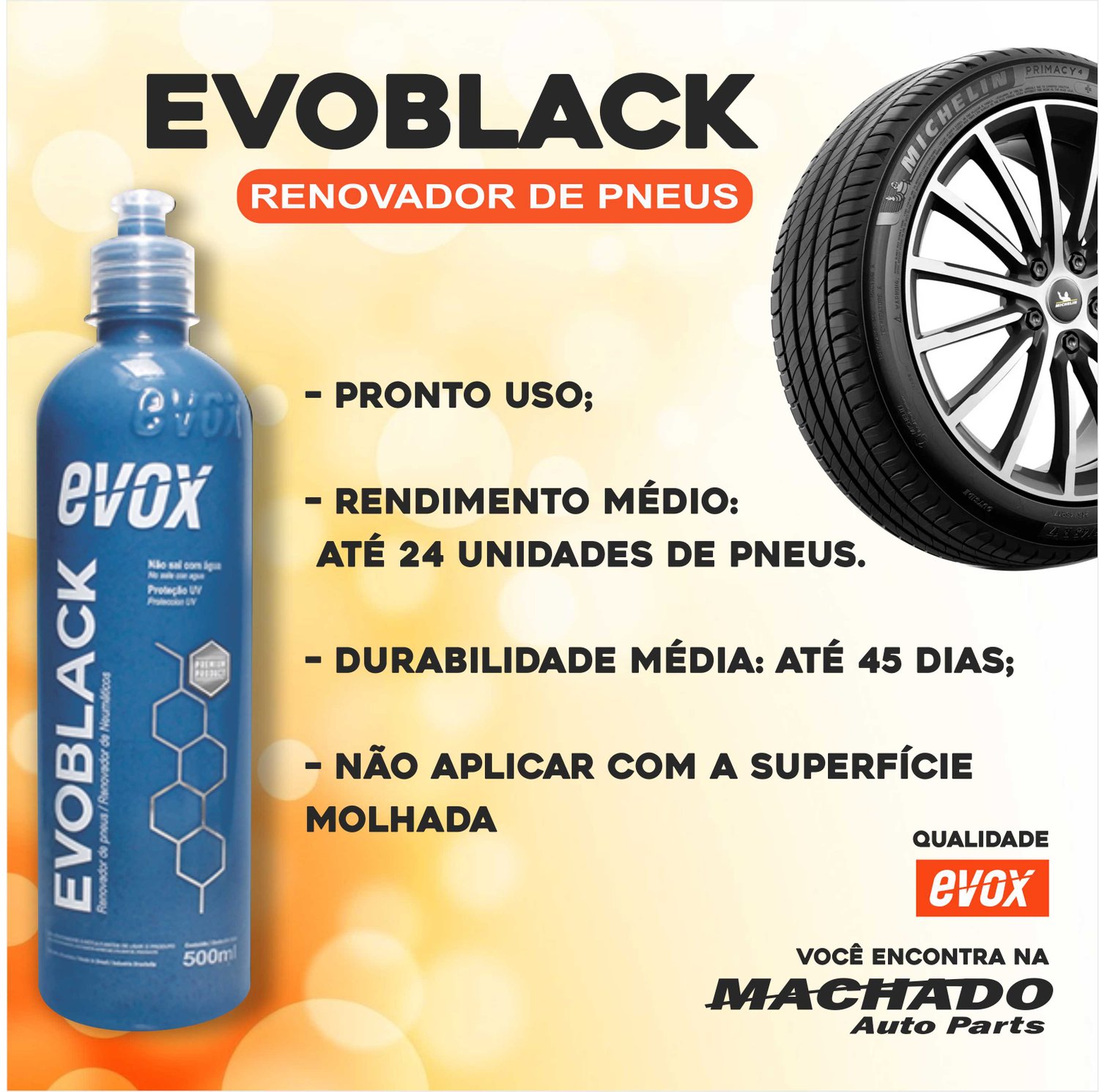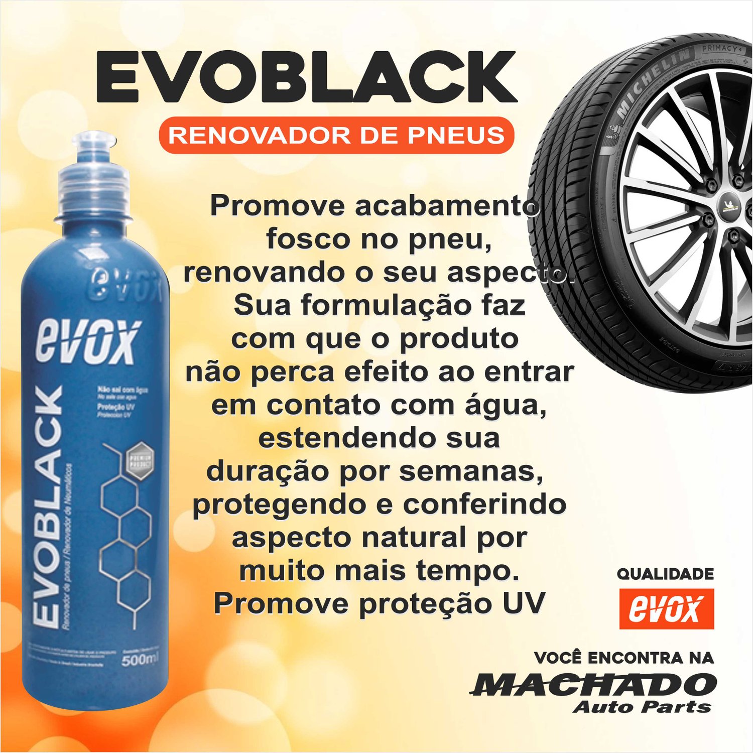 Evoblack é um produto que promove acabamento fosco no pneu, renovando o seu aspecto. Sua formulação faz com que o produto não perca efeito ao entrar em contato com água, estendendo sua duração por semanas, protegendo e conferindo aspecto natural por muito mais tempo. Promove proteção UV.