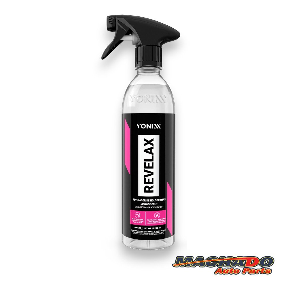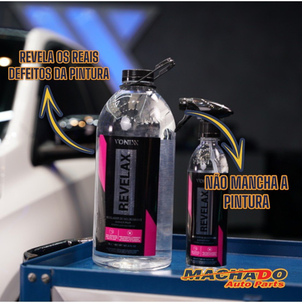 REVELAX evidencia defeitos da pintura, como hologramas e swirls mascarados por ceras, selantes e polidores. É também recomendado para limpeza de vidros e descontaminação de plásticos, principalmente antes da aplicação de V-Plastic, removendo produtos como silicones e contaminações diversas. Seu uso deixa a peça pronta para inspeção antes de qualquer trabalho.