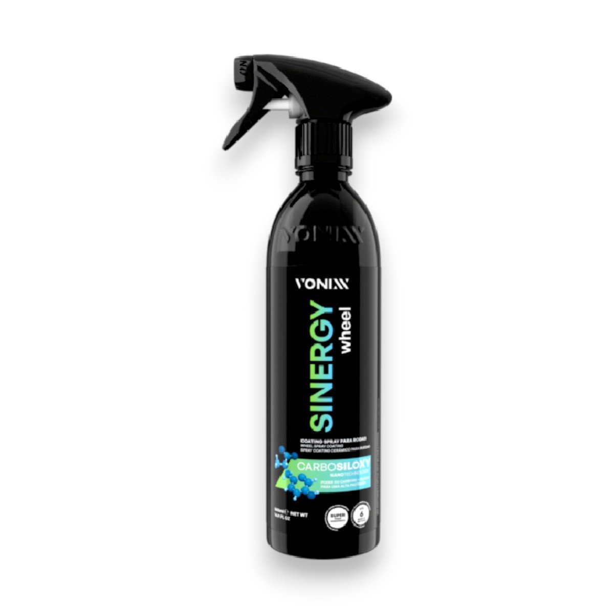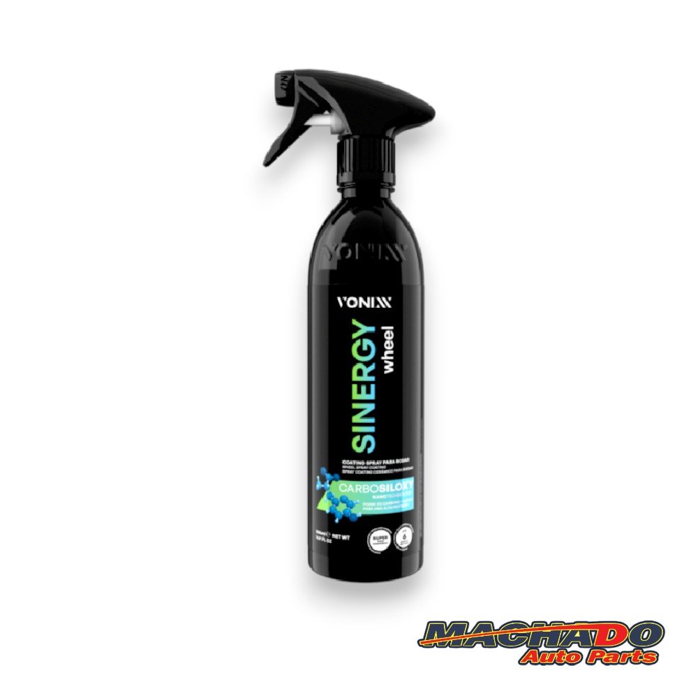 SINERGY WHEEL SPRAY COATING foi desenvolvido para proteger e dar brilho em rodas com proteção de até 6 meses.O produto traz a nanotecnologia exclusiva da Vonixx, CARBOSILOXY, onde o elemento químico carbono age em sinergia com o Silício para formar um filme resistente e super hidrofóbico. Um dos diferenciais desse produto é o tamanho da cadeia carbônica, que, por ser mais longa, promove resistência superior às altas temperaturas que passam da frenagem para a roda.