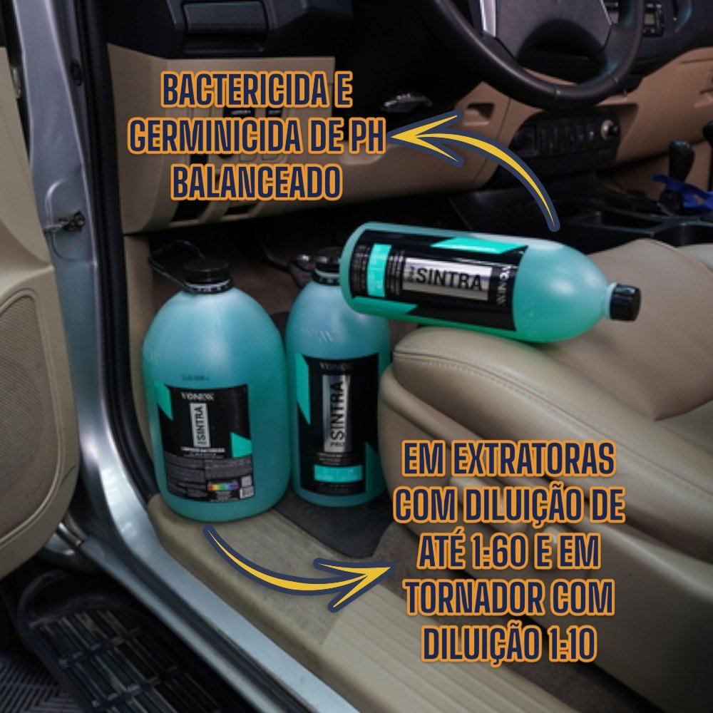 Sua fórmula avançada proporciona alta eficiência na remoção de manchas de gordura e sujeiras diversas, ao mesmo tempo em que elimina microrganismos que podem causar doenças no interior do veículo. Além disso, Sintra Pro ajuda a reduzir odores indesejáveis, deixando o ambiente interno mais limpo, saudável e livre de impurezas.