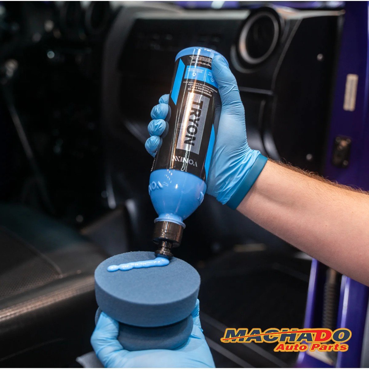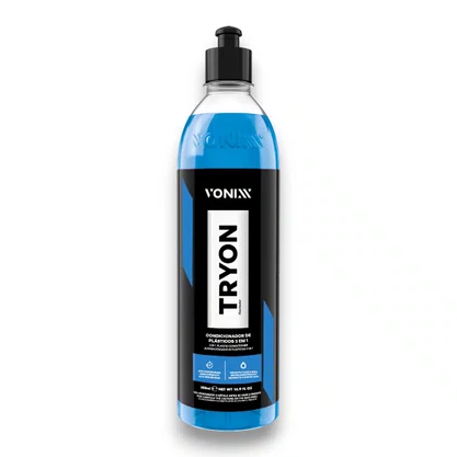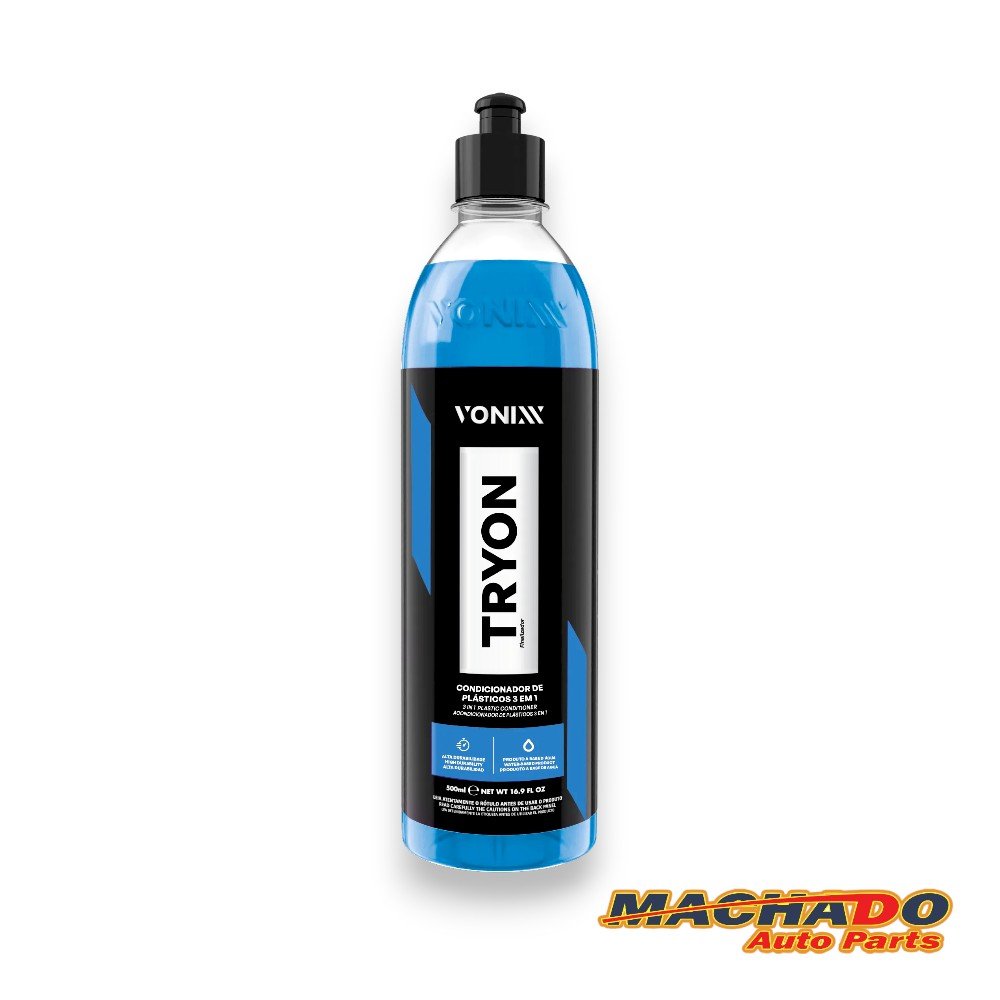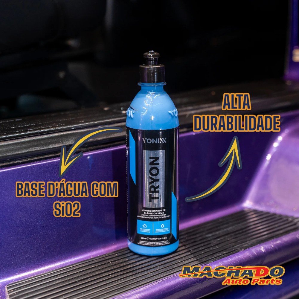 Tryon é um condicionador de plásticos 3 em 1, desenvolvido para restaurar plásticos internos, externos e borrachas. O produto é à base d’água e contém SiO2 em sua fórmula, o que proporciona alta durabilidade. Ele protege plásticos internos por até 12 meses, plásticos externos por até 3 meses e borrachas por até 6 meses. O produto oferece renovação e hidrorrepelencia, mantendo a superfície protegida.